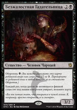 Карта Безжалостная Гадательница пойдёт всем, кто играет чёрным цветом, однако в связке с картой Кровосос из Керу вы сами выбираете кто умрёт и когда брать карты. Но самое главное, что все эти действия также наполняют вам кладбище. А значит, будет работать главное свойство Султаев – Выкапывание.