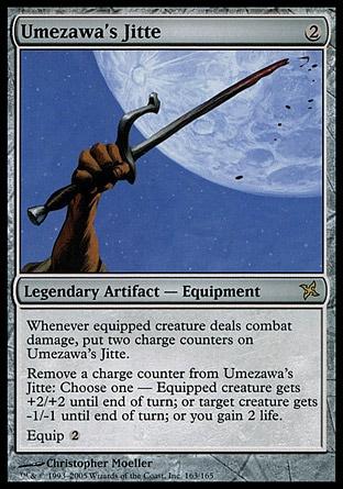 Оборудование хорошо сочетается с первым ударом на Талии (жетоны на Umezawa's Jitte появляются раньше, чем существа смогут нанести регулярные повреждения, способности Sword of Fire and Ice тоже разыгрываются раньше).