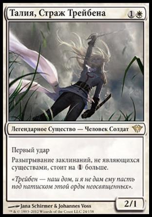 Thalia, Guardian of Thraben – основное оружие D&T против комбо-колод, при этом Талия сильно напрягает и прочие деки, опирающиеся на разыгрывание недорогих заклинаний в условиях малого количества земель (таких как, например, все разновидности колод на Delver of Secrets). Поскольку количество заклинаний несуществ в D&T невелико, способность Талии несильно влияет на нашу игру. Это классический пример карты, ломающей игру оппонента, при этом идеально поддерживающей стратегию D&T обезоружить и победить. Первый удар у Талии также очень важен, эта способность позволяет не бояться блокеров и «раньше» получать жетоны на Umezawa's Jitte. Другой сильной стороной Талии является её легендарность, что даёт возможность спасать стойкую девушку в трудные для неё времена за счёт способности своего Karakas.