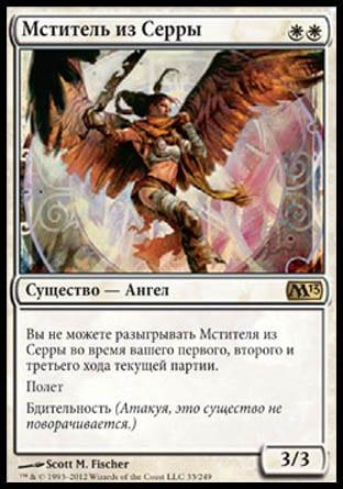 Serra Avenger – прекрасное атакующее существо с хорошими показателями силы/выносливости и низкой манастоимостью. Недостаток, связанный с невозможностью розыгрыша Мстителя раньше четвертого хода, компенсируется за счет наличия в колоде Aether Vial. Бдительность позволяет оказывать давление на оппонента, не думая о собственных блоках. Идеальный кандидат для ношения оборудования.