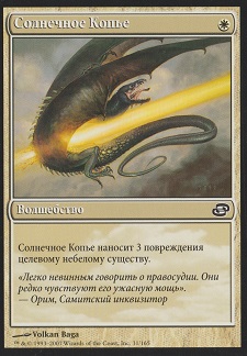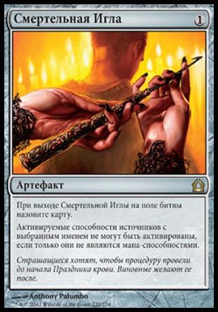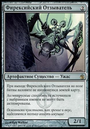 Phyrexian Revoker – маленький агент Фирексии выполняет значимую роль, еще больше запутывая игру оппонента. Целей для его применения в Легаси предостаточно – Sensei's Divining Top, Lion's Eye Diamond, Lotus Petal, Grim Lavamancer, Sneak Attack, Grindstone, Simian Spirit Guide, Deathrite Shaman, все возможные Planeswalkers, любое оборудование и так далее. В редких матчах Отзыватель совершенно бесполезен, в таком случае он отсайживается после первой партии. По сравнению с Pithing Needle у Отзывателя есть как плюсы (тело 2/1, возможность указать в качестве цели манадающие источники, не являющиеся землями), так и минусы (уже упомянутая невозможность выбрать целью мешающие земли противника). При этом Отзыватель легко ставится с бесцветных земель, давая нам возможность использовать Равнины для розыгрыша других существ. Обязательно помните, что Вы называете цель для Отзывателя в момент, когда он выходит на поле битвы, в этом случае у оппонента уже нет возможности использовать способности названного перманента.