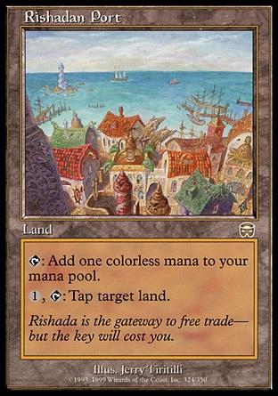 Rishadan Port и Wasteland – по сути эти карты в первую очередь нужны для уничтожения манабазы оппонента и ограничения его ресурсов, и только во вторую очередь – предназначены для розыгрыша заклинаний. Большинство колод в Легаси играют небазовыми землями, поэтому Wasteland – это часто бесцветный Stone Rain, который нельзя отменить. Rishadan Port, как правило, используется в шаг поддержки на ходе противника. В таком случае он не может разыграть существо или волшебство с использованием загнутой Портом земли. Вместе с Талией действие Rishadan Port и Wasteland особенно разрушимо для оппонента, что нередко позволяет нам нанести необходимые для победы 20 единиц повреждений до того момента, как он сможет восстановить свои земли.