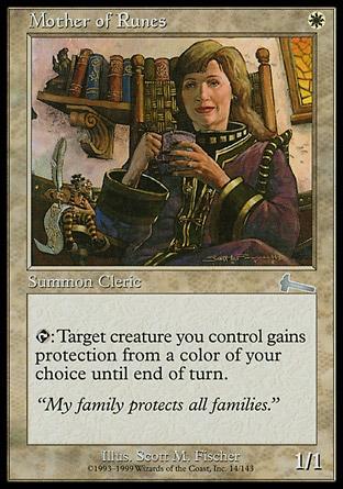 Mother of Runes – c момента выхода в 1999 году Mother of Runes (или проще говоря “Мать”) является эффективным и удобным способом защиты своих подопечных. Находясь на столе, она позволяет не бояться заклинаний оппонента, целящих ключевых существ, с легкостью атаковать противника через его потенциальных блокеров, самому пилоту совершать выгодные блоки, не теряя существ в битве. Другими словами, Мать позволяет кардинально поменять саму структуру боя, при этом заставив оппонента пересмотреть возможности применения своих заклинаний, взаимодействующих с существами. Отсюда одно из правил Легаси, которое не стоит воспринимать чересчур всерьез – «Убей Мать, пока она болеет». Казалось бы, всего лишь 1/1 за 1 белую ману, а сколько возможностей! Учитывая, что сила D&T строится на существах, неудивительно, что меньше, чем в комплект, Матерей не играют. Изредка, в игре встречаются ситуации, когда Матерью ходят в атаку, но это единичные случаи (например, когда у оппонента в колоде нет карт, способных причинить вред вашим существам, или когда нужно пронести критичную единицу урона).