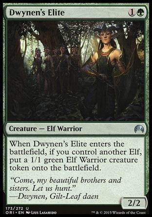 Когда Отборные Бойцы Двайнен выходят на поле битвы, если вы контролируете другого Эльфа, положите на поле битвы одну фишку существа 1/1 зеленый Эльф Воин.