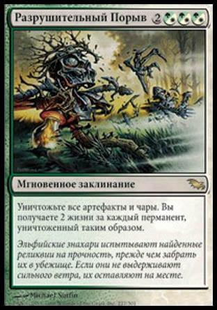 — Универсальная карта, которая может пригодиться и в матче против агрессии, как масс-ремувал, и против Боглов, и против каких-нибудь комбо-колод вроде Шторма (все карты, позволяющие ему быстро «закрутиться» это перманенты с конвертированной стоимостью 2). Неплохо справляется с любыми токенами. «Швейцарский нож» сайдборда. В среднем 3 копии.