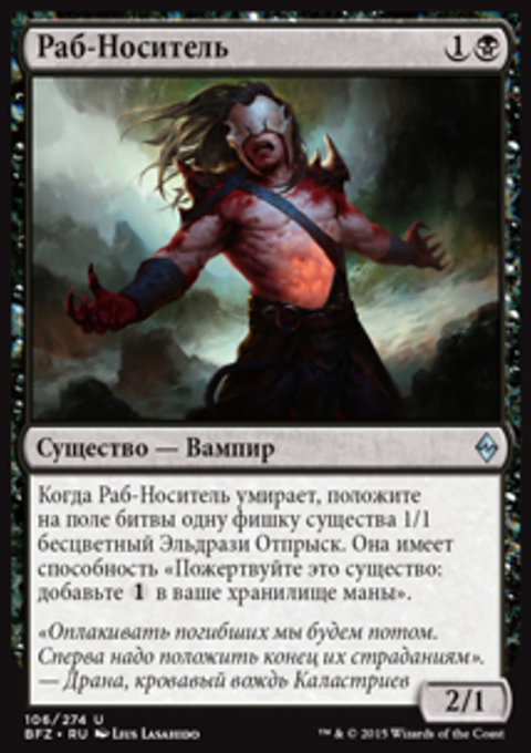 Когда Раб-Носитель умирает, положите на поле битвы одну фишку существа 1/1 бесцветный Эльдрази Отпрыск. Она имеет способность «Пожертвуйте это существо: добавьте