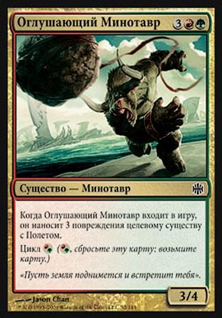 Когда Оглушающий Минотавр входит в игру, он наносит 3 повреждения целевому существу с Полетом.