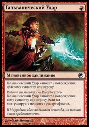 Работа по металлу — Вместо этого Гальванический Удар наносит 4 повреждения тому существу или игроку, если вы контролируете не менее трех артефактов.