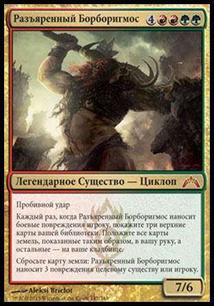 Каждый раз, когда Разъяренный Борборигмос наносит боевые повреждения игроку, покажите три верхние карты вашей библиотеки. Положите все карты земель, показанные таким образом, в вашу руку, а остальные — на ваше кладбище.