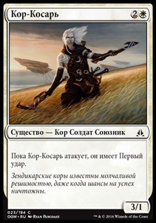 Каждый раз, когда снаряженное существо атакует, положите на поле битвы одну фишку существа 1/1 белый Кор Союзник повернутой и атакующей.