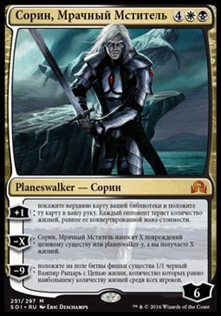 −X: Сорин, Мрачный Мститель наносит Х повреждений целевому существу или planeswalker-у, а вы получаете Х жизней.