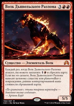 и сбросить карту. Если вы это делаете, Волк Дьявольского Разлома наносит целевому существу или planeswalker-у повреждения, равные конвертированной мана-стоимости сброшенной карты.