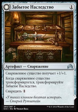 Когда снаряженное существо трансформируется, трансформируйте Забытое Наследство.
