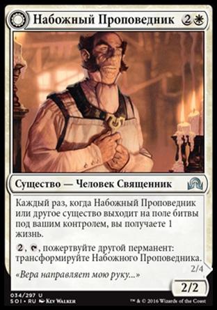 Каждый раз, когда Набожный Проповедник или другое существо выходит на поле битвы под вашим контролем, вы получаете 1 жизнь.