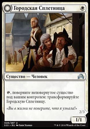 Повернуть, поверните неповернутое существо под вашим контролем: трансформируйте Городскую Сплетницу.