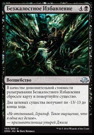В качестве дополнительной стоимости разыгрывания Безжалостного Избавления сбросьте карту и пожертвуйте существо.