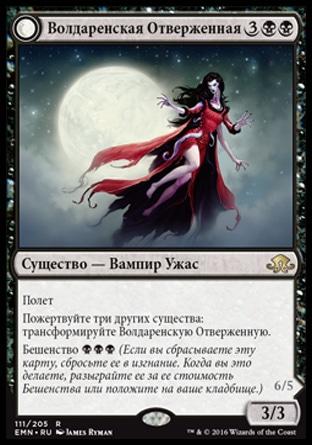 Каждый раз, когда Ханвир, Змеящийся Городок атакует, положите на поле битвы две фишки существа 3/2 бесцветный Эльдрази Ужас повернутыми и атакующими.