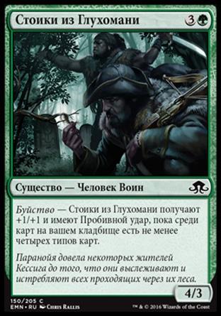 Буйство — Стоики из Глухомани получают +1/+1 и имеют Пробивной удар, пока среди карт на вашем кладбище есть не менее четырех типов карт.