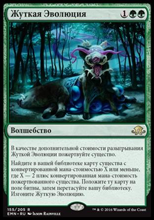 Найдите в вашей библиотеке карту существа с конвертированной мана-стоимостью Х или меньше, где X — 2 плюс конвертированная мана-стоимость пожертвованного существа. Положите ту карту на поле битвы, затем перетасуйте вашу библиотеку. Изгоните Жуткую Эволюцию.