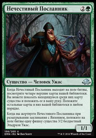 Когда Нечестивый Посланник выходит на поле битвы, посмотрите четыре верхние карты вашей библиотеки. Вы можете показать находящуюся среди них карту существа и положить ее в вашу руку. Положите остальные карты в низ вашей библиотеки в любом порядке.
