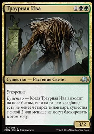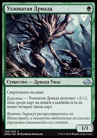Буйство — Узловатая Дриада получает +2/+2, пока среди карт на вашем кладбище есть не менее четырех типов карт.