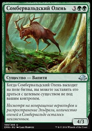 Когда Сомбервальдский Олень выходит на поле битвы, вы можете заставить его драться с целевым существом не под вашим контролем.