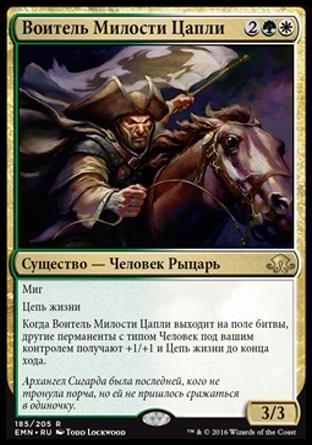 : целевой атакующий Человек получает +1/+1 до конца хода.