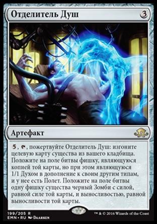 , пожертвуйте Отделитель Душ: изгоните целевую карту существа из вашего кладбища. Положите на поле битвы фишку, являющуюся копией той карты, но при этом являющуюся 1/1 Духом в дополнение к своим другим типам, и у нее есть Полет. Положите на поле битвы одну фишку существа черный Зомби с силой, равной силе той карты, и выносливостью, равной выносливости той карты.