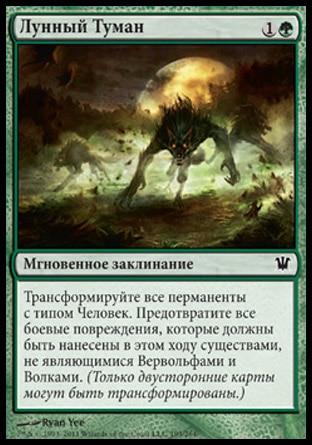 Трансформируйте все перманенты с типом Человек. Предотвратите все боевые повреждения, которые должны быть нанесены в этом ходу существами, не являющимися Вервольфами и Волками. (Только двусторонние карты могут быть трансформированы.)