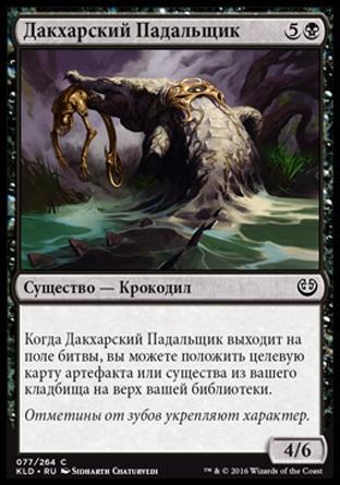 Когда Дакхарский Падальщик выходит на поле битвы, вы можете положить целевую карту артефакта или существа из вашего кладбища на верх вашей библиотеки.