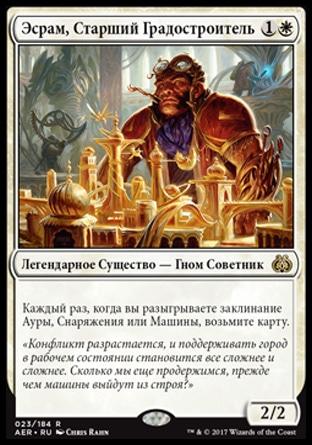 3+ Как показали драфты на Каладеше, «машинные» колоды — рискованный план, который может провалиться, оставив за собой кучу неработающего железа. С другой стороны, неплохое летающее существо не помешает, а бонусный полёт машинкам не лишний.