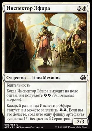 Каждый раз, когда Инспектор Эфира атакует, вы можете заплатить {Energy}{Energy}. Если вы это делаете, создайте одну фишку артефакта существа 1/1 бесцветный Сервотрон.