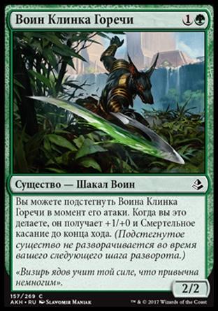 Вы можете подстегнуть Воина Клинка Горечи в момент его атаки. Когда вы это делаете, он получает +1/+0 и Смертельное касание до конца хода. (Подстегнутое существо не разворачивается во время вашего следующего шага разворота.)