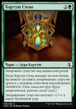 Когда Картуш Силы выходит на поле битвы, вы можете заставить зачарованное существо драться с целевым существом под контролем оппонента. (Они наносят друг другу повреждения, равные своей силе.)