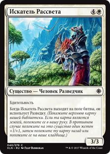 Когда Искатель Рассвета выходит на поле битвы, он использует Разведку. (Покажите верхнюю карту вашей библиотеки. Если та карта является землей, положите ее в вашу руку. В противном случае положите на это существо один жетон +1/+1, затем положите ту карту назад или положите ее на ваше кладбище.)