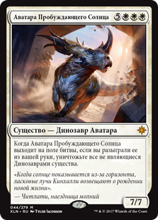 Когда Аватара Пробуждающего Солнца выходит на поле битвы, если вы разыграли ее из вашей руки, уничтожьте все не являющиеся Динозаврами существа.