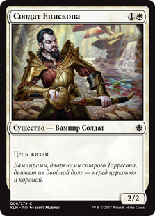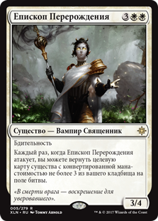 Каждый раз, когда Епископ Перерождения атакует, вы можете вернуть целевую карту существа с конвертированной мана-стоимостью не более 3 из вашего кладбища на поле битвы.
