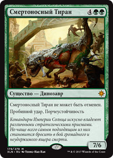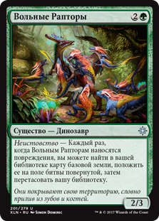 Неистовство — Каждый раз, когда Вольным Рапторам наносятся повреждения, вы можете найти в вашей библиотеке карту базовой земли, положить ее на поле битвы повернутой, затем перетасовать вашу библиотеку.