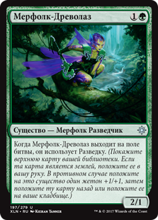 Когда Мерфолк-Древолаз выходит на поле битвы, он использует Разведку. (Покажите верхнюю карту вашей библиотеки. Если та карта является землей, положите ее в вашу руку. В противном случае положите на это существо один жетон +1/+1, затем положите ту карту назад или положите ее на ваше кладбище.)