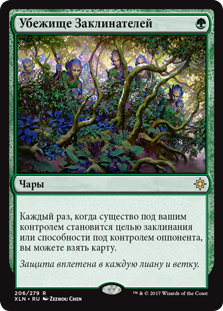 Когда Чародейка Волшебных Лиан выходит на поле битвы, положите один жетон +1/+1 на каждого из не более двух целевых Мерфолков под вашим контролем.