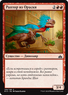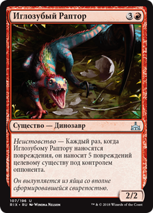 Неистовство — Каждый раз, когда Иглозубому Раптору наносятся повреждения, он наносит 5 повреждений целевому существу под контролем оппонента.