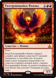 Когда Разгорающийся Феникс умирает, создайте одну фишку существа 0/1 красный Элементаль со способностью «В начале вашего шага поддержки пожертвуйте это существо и верните целевую карту с именем Разгорающийся Феникс из вашего кладбища на поле битвы. Она получает Ускорение до конца хода».