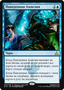 Когда Наведенная Амнезия выходит на поле битвы, целевой игрок изгоняет все карты из своей руки рубашкой вверх, затем берет столько же карт.