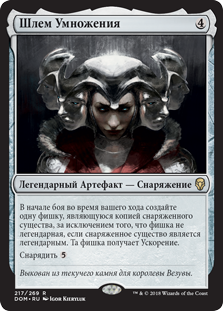 2 Потенциально интересная карта. Каждый ход получать клон существа звучит душевно и волшебно. Но суровая реальность, полагаю, эти планы испортит. Пока вы возитесь с Шлемом, оппонент наставит угроз, а первый же ремувал в экипированное существо отправит вас в каменный век, поскольку первая фишка обойдётся вам в 14 ман.