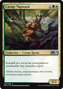 Каждый раз, когда вы разыгрываете заклинание Ауры, целью которого является Друид-Рогач, создайте одну фишку существа 3/3 зеленый Зверь.