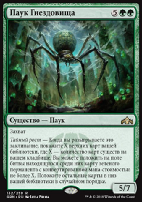 Тайный рост — Когда вы разыгрываете это заклинание, покажите X верхних карт вашей библиотеки, где X — количество карт существ на вашем кладбище. Вы можете положить на поле битвы находящуюся среди них карту зеленого перманента с конвертированной мана-стоимостью не более X. Положите остальные карты в низ вашей библиотеки в случайном порядке.
