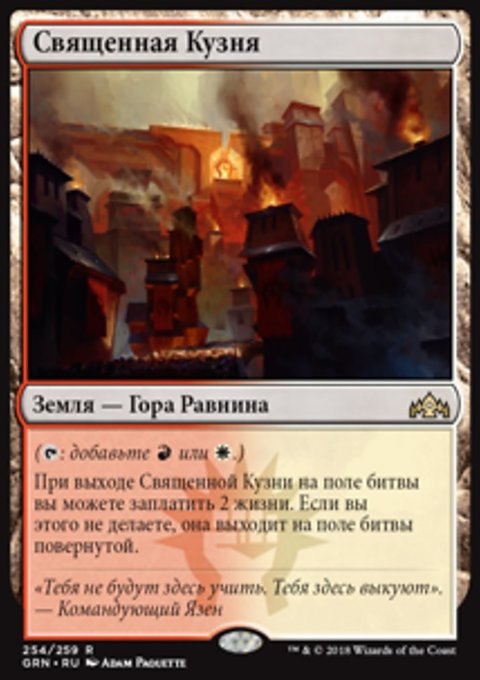 При выходе Священной Кузни на поле битвы вы можете заплатить 2 жизни. Если вы этого не делаете, Священная Кузня выходит на поле битвы повернутой.