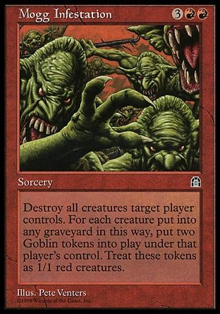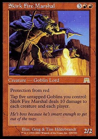 Когда Маршал Могг входит в игру или попадает на кладбище из игры, положите одну фишку существа 1/1 красный Гоблин в игру.