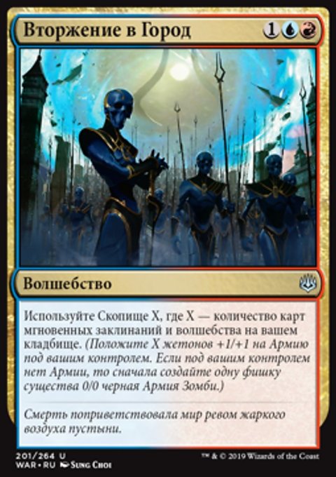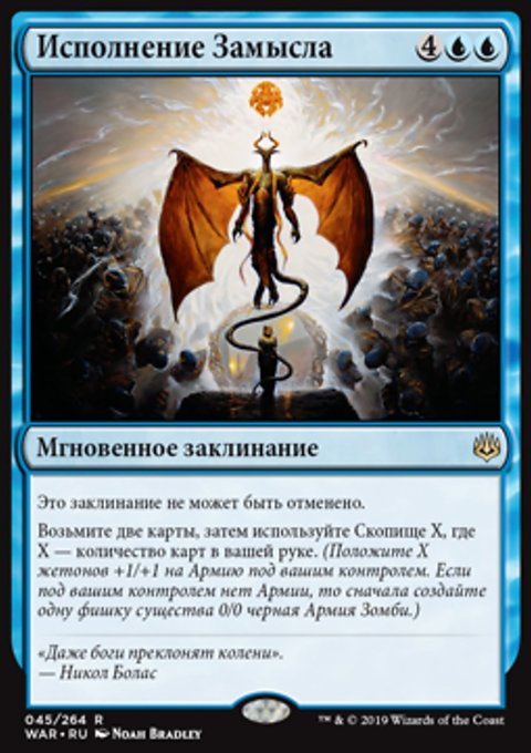 Возьмите две карты, затем используйте Скопище X, где X — количество карт в вашей руке. (Положите X жетонов +1/+1 на Армию под вашим контролем. Если под вашим контролем нет Армии, то сначала создайте одну фишку существа 0/0 черная Армия Зомби.)
