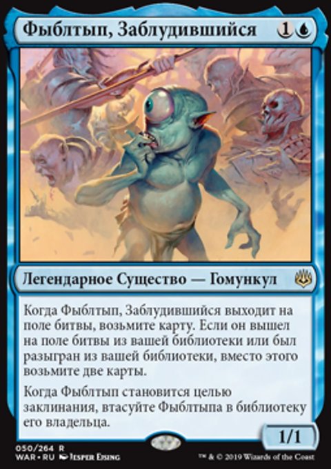 Когда Фыблтып, Заблудившийся выходит на поле битвы, возьмите карту. Если он вышел на поле битвы из вашей библиотеки или был разыгран из вашей библиотеки, вместо этого возьмите две карты.